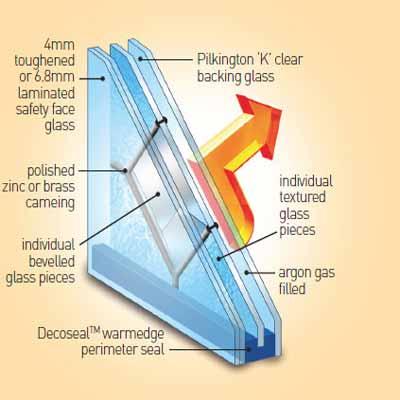 Quite simply, the decorative triple glazed unit has distinct advantages over that of the double glazed version. The decorative elements are encapsulated between two panes of glass making it easier to clean….no dust or dirt can gather on the decorative elements nor can the cames oxidise or discolour.